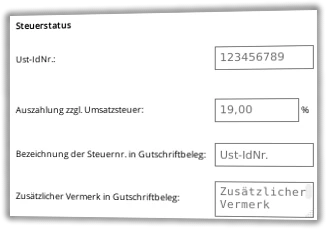 Die Bezeichnung der Steuernummer im PDF-Beleg ist üblicherweise Ust-IdNr. in Deutschland bzw. UID in Österreich. Eine Übersicht gängiger Abkürzungen bietet die Wikipedia in englischer Sprache. Ohne Programmierarbeiten lässt sich die Bezeichnung der Steuernummer pro Affiliate und Auszahlung frei angeben.