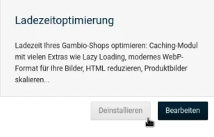 Die Deinstallation des Moduls löscht das Cache-Verzeichnis, entfernt die RewriteRules aus der .htaccess-Datei und deaktiviert sämtliche Optimierungen. Aus dem Ladezeitoptimierungs-Modul resultierende Probleme sollten also nach der Deinstallation über das Modul-Center im Gambio-Admin nicht mehr auftreten. Weitere Informationen finden sich in den Hinweisen zur Deinstallation der Ladezeitoptimierung.