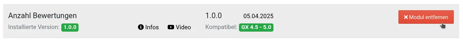 Die Deinstallation des „Anzahl Bewertungen“ Moduls ist genauso einfach wie die Installation. In der Modulverwaltung sorgt ein Klick auf den Button Entfernen dafür, dass die Moduldateien aus dem Shop gelöscht und die involvierten Caches geleert werden. Das Modul hat natürlich keinerlei Gambio-Originaldateien verändert und kam völlig ohne eigene Datenbankeinträge aus. Deshalb sind nach Entfernen der Moduldateien keinerlei Rückstände des kostenlosen Tools mehr im Shop vorhanden.