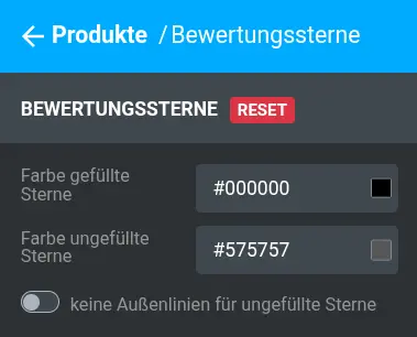 #ee8931 - Farbe ungefüllte Sterne: In Gambio-Version 5.0.0.0 ist das in Wahrheit die Rahmenfarbe für unausgefüllte Sterne. Die eigentliche Füllfarbe ist nicht einstellbar. Entsprechend ist die Option keine Außenlinien für ungefüllte Sterne komplett sinnfrei. Denn ohne Außenlinien sind die unausgefüllten Sterne einfach unsichtbar.