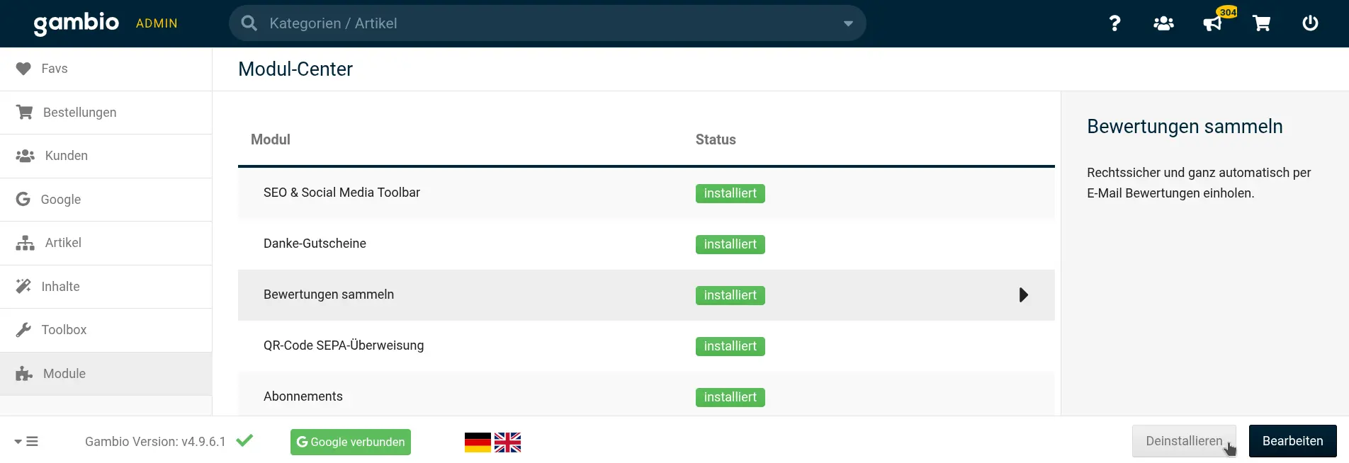 Und weil Übung den Meister macht, klicken wir gleich nochmal: Nachdem wir auch im Gambio Modul-Center auf Installieren geklickt haben, ist der Bumerang startklar. Mit einem Klick auf Bearbeiten oder über die neue Admin-Menübox Bewertungen sammeln beginnen wir sofort damit, die ersten Bewertungen zielsicher einzufangen! 🚀