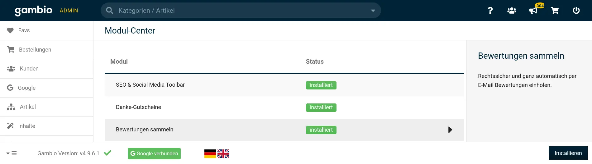Die Installation erfolgt also einfach auf Knopfdruck im Gambio-Admin.