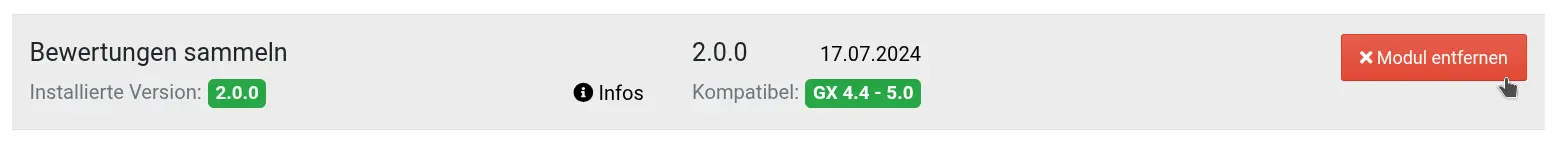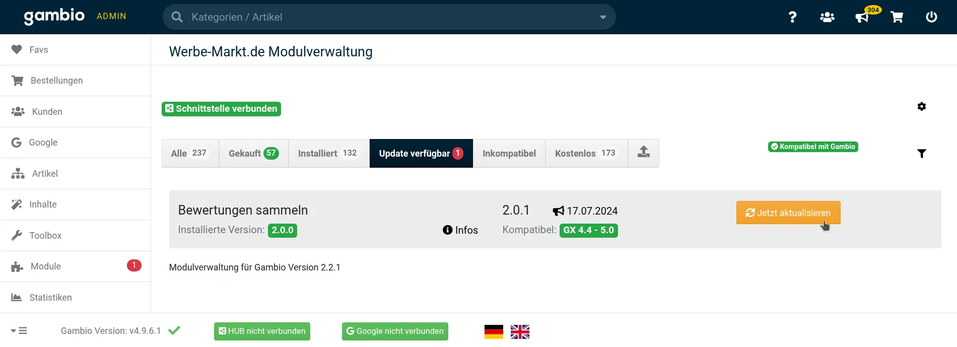 Modul-Updates sind dabei weniger Reparaturen am Bumerang, sondern vielmehr Upgrades für seine Flugeigenschaften! So haben wir ihm zum Beispiel nachträglich eine „Kamera“ für das Rezensionsfeed für Google eingebaut – ein Feature, das es anfangs noch nicht gab. Eine rot hinterlegte Zahl im Gambio-Admin ist das Signal vom Hersteller: „Es gibt ein neues Aerodynamik-Upgrade für deinen Bumerang!“ Dieses Tuning spielen wir dann ganz einfach via Button-Klick in der Modulverwaltung ein.