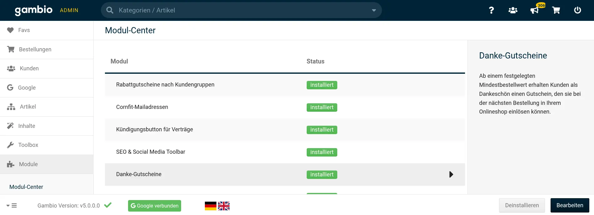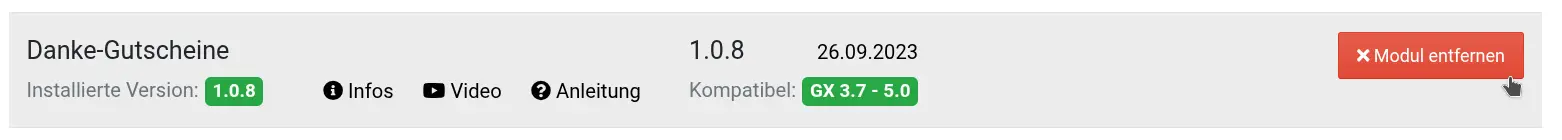 ⚠️ Bereits bei der Deinstallation im Modul-Center gehen alle Einstellungen zu den Danke-Gutscheinen verloren. Bereits generierte Gutscheine bleiben aber innerhalb des Gambio-Gutscheinsystem erhalten.