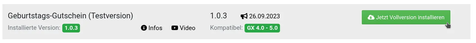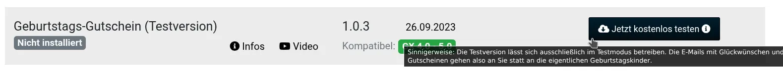 Das „Geburtstags-Gutschein“ Modul steht in einer kostenlosen Testversion über die ebenfalls kostenlose Modulverwaltung parat. Voraussetzung für die Installation von Testversionen: Der ebenfalls kostenlose ionCube-Loader muss auf dem Server verfügbar sein. Dann lädt ein Klick auf Jetzt kostenlos testen das Modul in den Shop. Nach anschließender Installation im Modul-Center steht es im Admin unter Gutscheine > Geburtstags-Gutschein zur unverbindlichen Instpektion und kostenlosen Probefahren bereit.