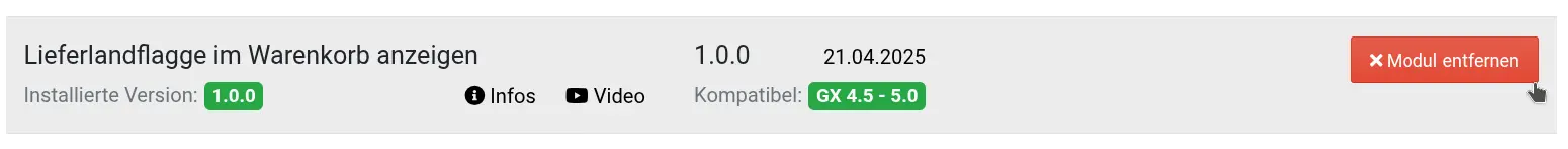 Das „Lieferlandflagge im Warenkorb anzeigen“ Modul entfernen wir ganz einfach durch Klick auf den Entfernen-Button der Modulverwaltung aus unserem Shop. Es hat weder Originaldateien verändert, noch benötigt es irgendwelche Einstelllungen. Es hinterlässt also keinerlei Rückstände.