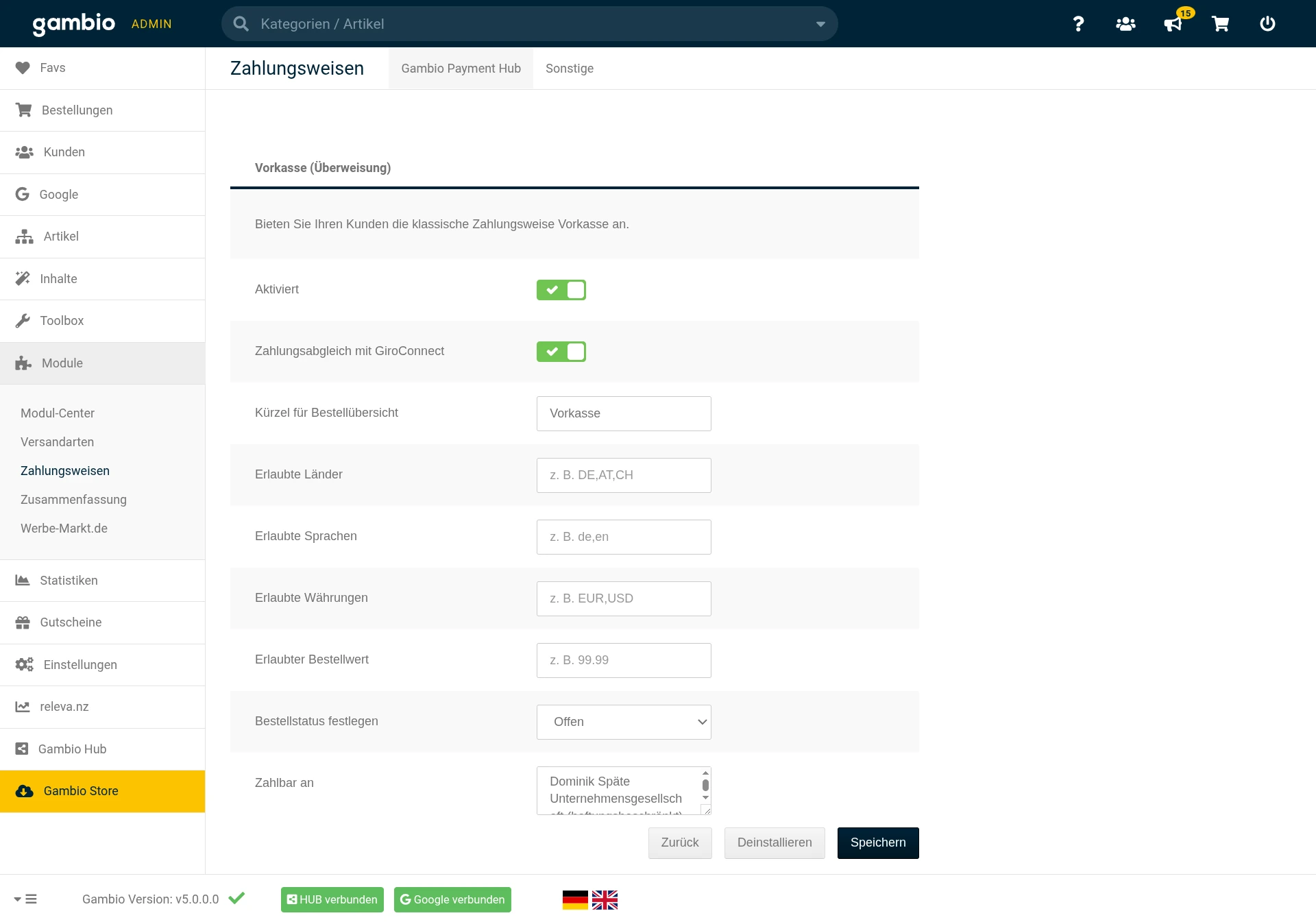 Im Gambio Payment Hub unter Module > Zahlungsweisen finden wir die Vorkasse (Überweisung) mit dem Modulcode MoneyOrderHub. Hier ist der Kontoinhaber im Zahlbar an betitelten Eingabefeld anzugeben.