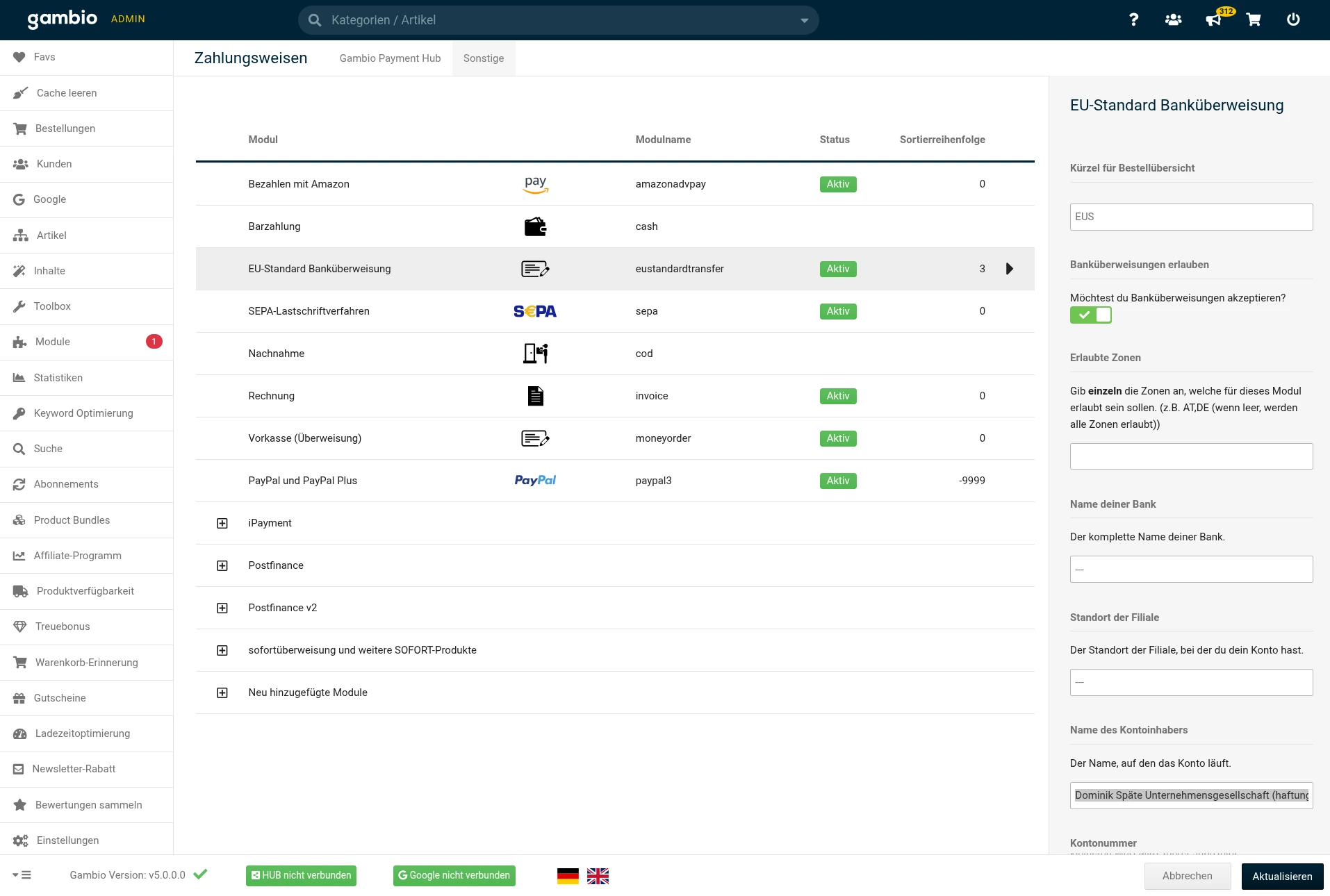 finden wir unter Module > Zahlungsweisen > Sonstige. Bei Name des Kontoinhabers kontrollieren wir, dass selbiger mit dem bei unserer Bank hinterlegten Namen übereinstimmt.