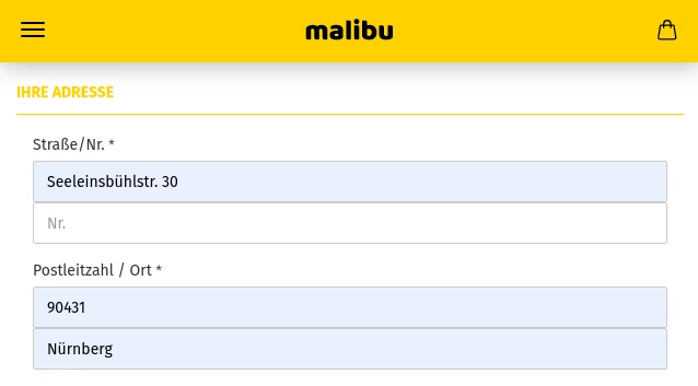 - Straße & Hausnummer werden nicht getrennt, also in einem gemeinsamen Feld abgefragt.