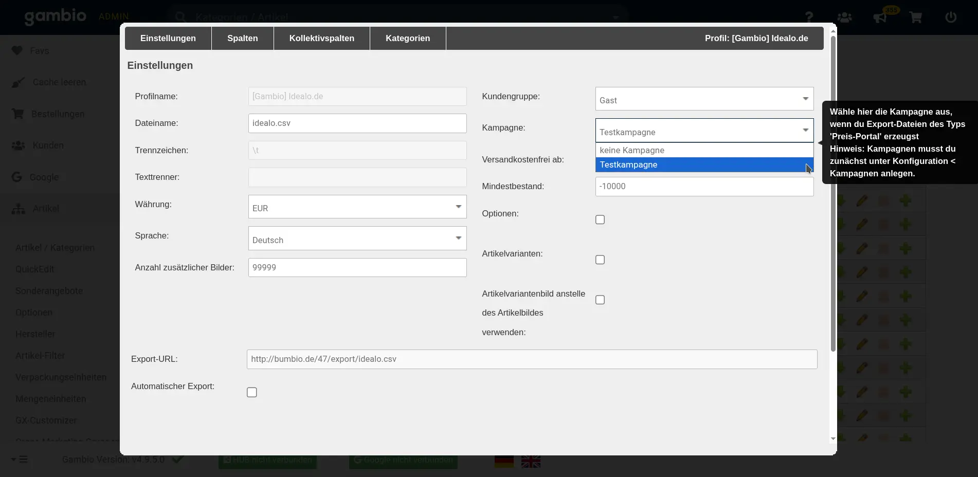 Die Einrichtung erfolgt im Adminbereich unter Einstellungen > Suchmaschinenoptimierung > Kampagnen – dort können Kampagnenname und RefID frei gewählt werden (die RefID darf nur aus Zahlen bestehen). Beim anschließenden Artikel-Export unter Artikel > Import/Export lässt sich die passende Kampagne zuweisen. In der Exportdatei werden die Produktlinks automatisch um die jeweilige RefID ergänzt – und sobald Kunden über diese Portale in den Shop gelangen, kann der Shopbetreiber genau sehen, welcher Kanal welchen Erfolg gebracht hat.
