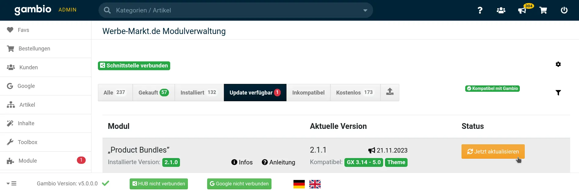 Eine rot hinterlegte Zahl im Gambio-Admin ist wie eine Nachricht vom Lieferanten für Verpackungsmaterial: „Es gibt neue, edle Schleifen für Ihre Geschenkkörbe!“ Dieses Upgrade holen wir uns dann ganz einfach via Button-Klick in der Modulverwaltung ab. 🎁