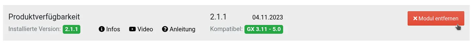 Um die Produktverfügbarkeit rückstandslos aus dem Shop zu entfernen, gehen wir genau die beiden umgekehrten Schritte wie bei der Installation durch. Zunächst deinstallieren wir das Modul im Modul-Center.