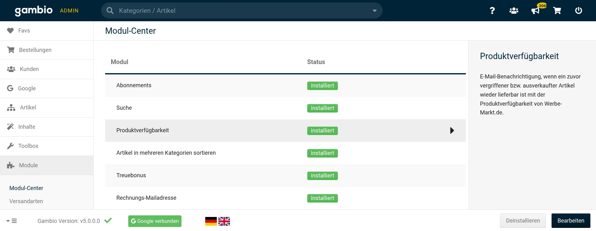 Die eigentliche Installation erfolgt über das Gambio Modul-Center. Dieses erreichen Sie durch Klick auf Module im Gambio-Adminbereich. Klicken Sie hier auf den Eintrag Produktverfügbarkeit und anschließend auf den rechts eingeblendet Installieren-Button. Damit ist das Modul bereits aktiv und Ihre Kunden bzw. Interessenten können sich über die Wiederverfügbarkeit vergriffener Artikel per E-Mail informieren lassen.
