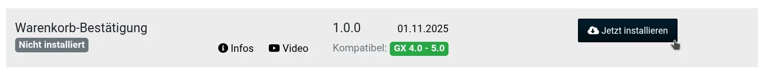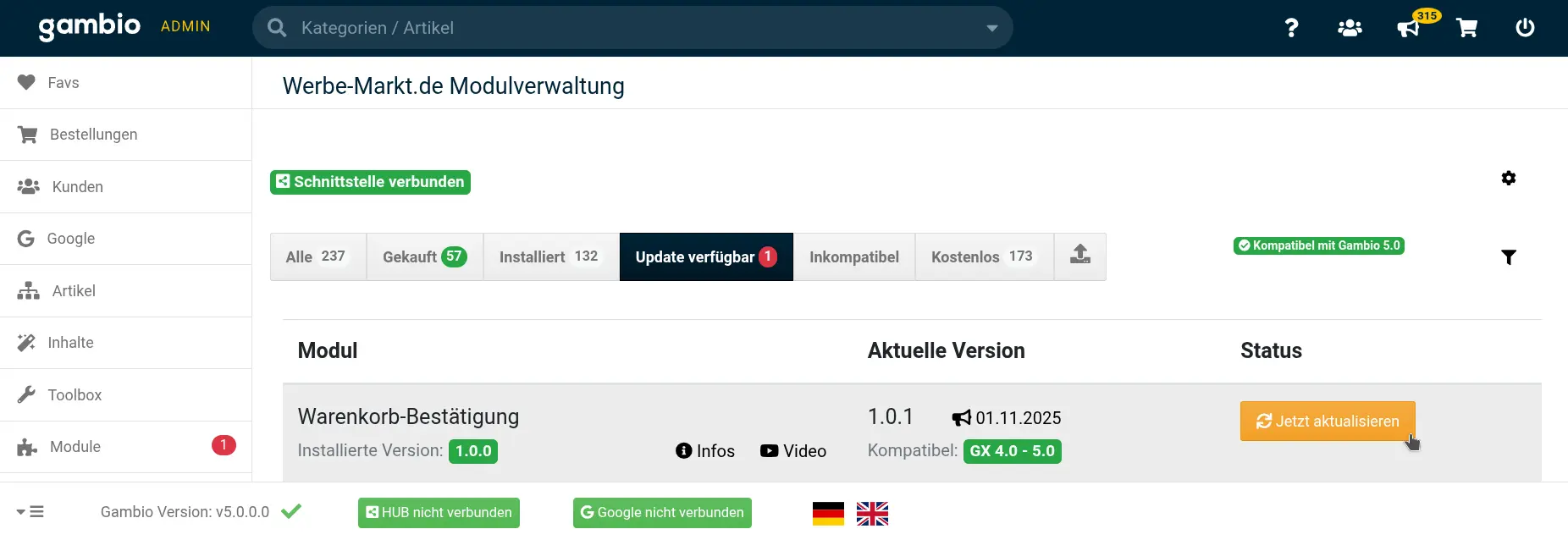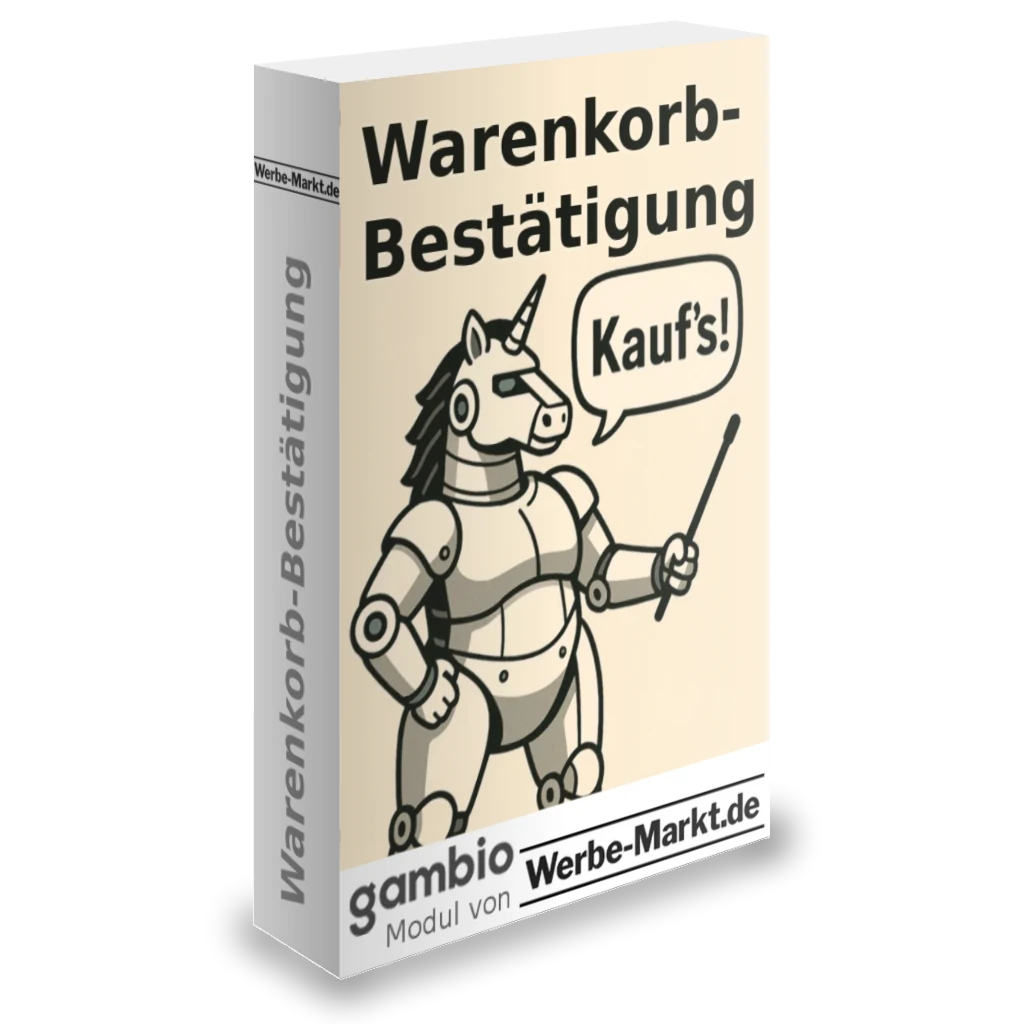 Wie die meisten meiner Gambio-Plugins steht auch das Modul âWarenkorb-BestĂ€tigungâ ĂŒber die kostenlose Modulverwaltung zum Abruf bereit. Die Installation erfolgt also einfach auf Knopfdruck im Gambio-Admin.