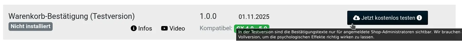 Das âWarenkorb-BestĂ€tigungâ Modul steht in einer kostenlosen Testversion ĂŒber die ebenfalls kostenlose Modulverwaltung parat. Voraussetzung: Der kostenlose ionCube-Loader muss auf dem Server verfĂŒgbar sein. Dann lĂ€dt ein Klick auf Jetzt kostenlos testen das Modul in den Shop. Nach anschlieĂender Installation im Modul-Center steht es im Admin unter Artikel > Artikel in Kategorien sortieren zur Begutachtung bereit.