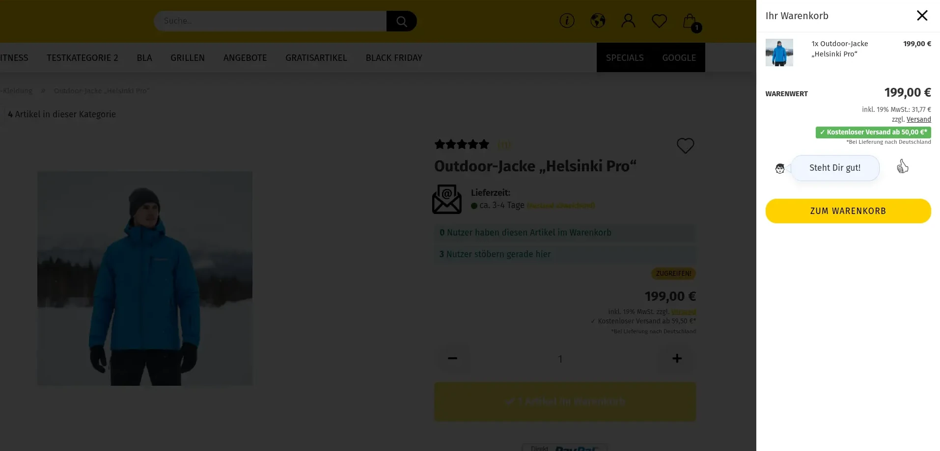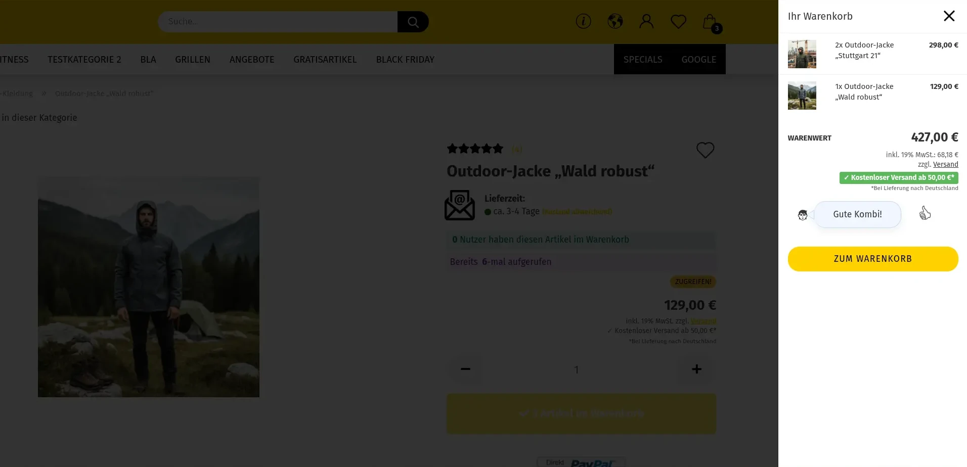 Durch eine winzige Einblendung bekrĂ€ftigt die Warenkorb-BestĂ€tigung potenzielle Kunden in ihrer Kaufabsicht und sorgt damit fĂŒr eine höhere Conversion Rate in unserem Shop.