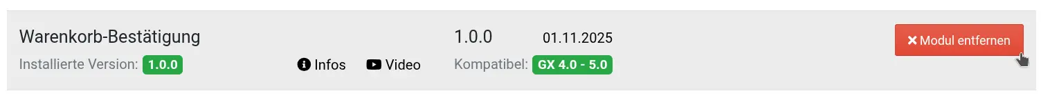 Um das âWarenkorb-BestĂ€tigungâ Modul rĂŒckstandslos aus dem Shop zu entfernen, genĂŒgt ein Klick auf den Button Entfernen in der Modulverwaltung. Dieser löscht die Moduldateien aus dem Shop. Damit sind die verwendeten Datenbanktabellen gelöscht. Da keinerlei Gambio-Originaldateien verĂ€ndert werden, sind also keine RĂŒckstĂ€nde des Moduls im Shop mehr vorhanden.