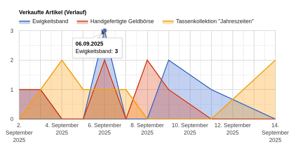 Die Absatzzahlen und ihre Statistiken sind für Sandra echte Gamechanger. Sie sieht auf einen Blick, wie sich das Ewigkeitsband, die Handgefertigte Geldbörse und die Tassenkollektion „Jahreszeiten“ in den letzten Tagen verkauft haben. So kann sie gezielt Werbekampagnen für besonders gefragte Produkte starten, während sie bei ruhigeren Artikeln rechtzeitig neue Impulse setzt. Dank dieser klaren Einblicke plant sie Produktneuheiten mit maximalem Erfolgspotenzial und trifft ihre Entscheidungen datenbasiert statt aus dem Bauch heraus. Das spart Ressourcen und steigert gleichzeitig den Umsatz ihres geliebten modified Shops.
