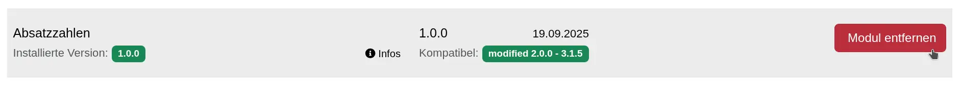 Und wenn wir uns vom Modul trennen möchten? Kein Problem! Um die „Absatzzahlen“ wieder vollständig und rückstandslos aus unserem modified Shop zu entfernen, klicken wir einfach auf den Entfernen-Button. Den finden wir wie gewohnt in der Modulverwaltung unter Module > Werbe-Markt.de. Ein Klick, und alles ist sauber entfernt. 🧹