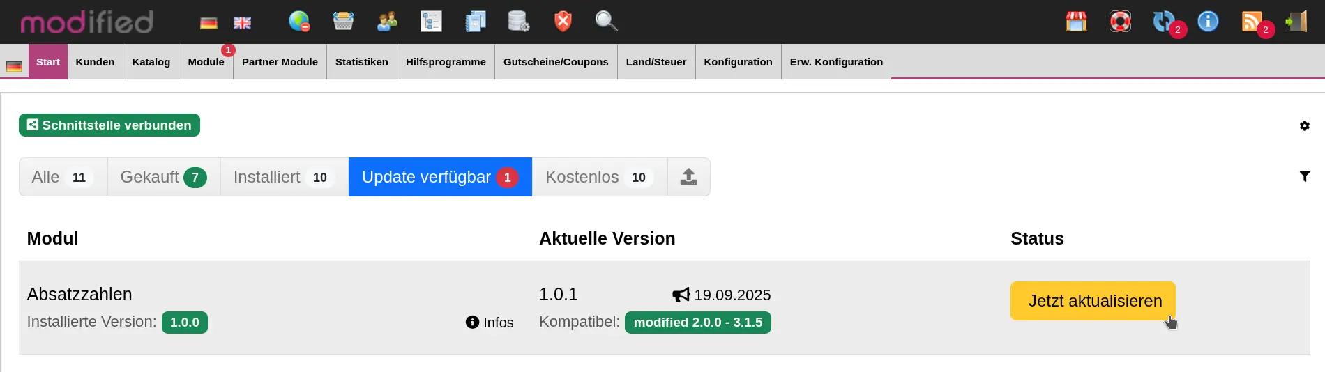 Starten wir unsere Verkaufsanalyse im Handumdrehen! Wie alle modified Module auf dieser Website steht auch das „Absatzzahlen“-Modul zur einfachen 1-Klick-Installation über unsere kostenlose Modulverwaltung für uns parat.
