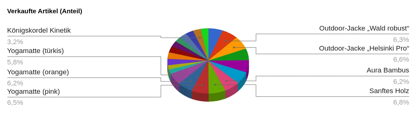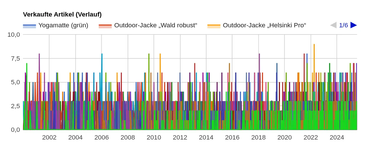 Dank der Absatzzahlen hat Jörn seinen Onlineshop für Sportartikel auf ein völlig neues Level gebracht. Die klaren Verkaufsverläufe seiner Yogamatte (grün), der Outdoor-Jacke „Wald robust“ und der Outdoor-Jacke „Helsinki Pro“ zeigen ihm präzise, welche Produkte boomen und wo er nachsteuern muss. So kann er Marketingmaßnahmen gezielt planen und sein Sortiment punktgenau erweitern.