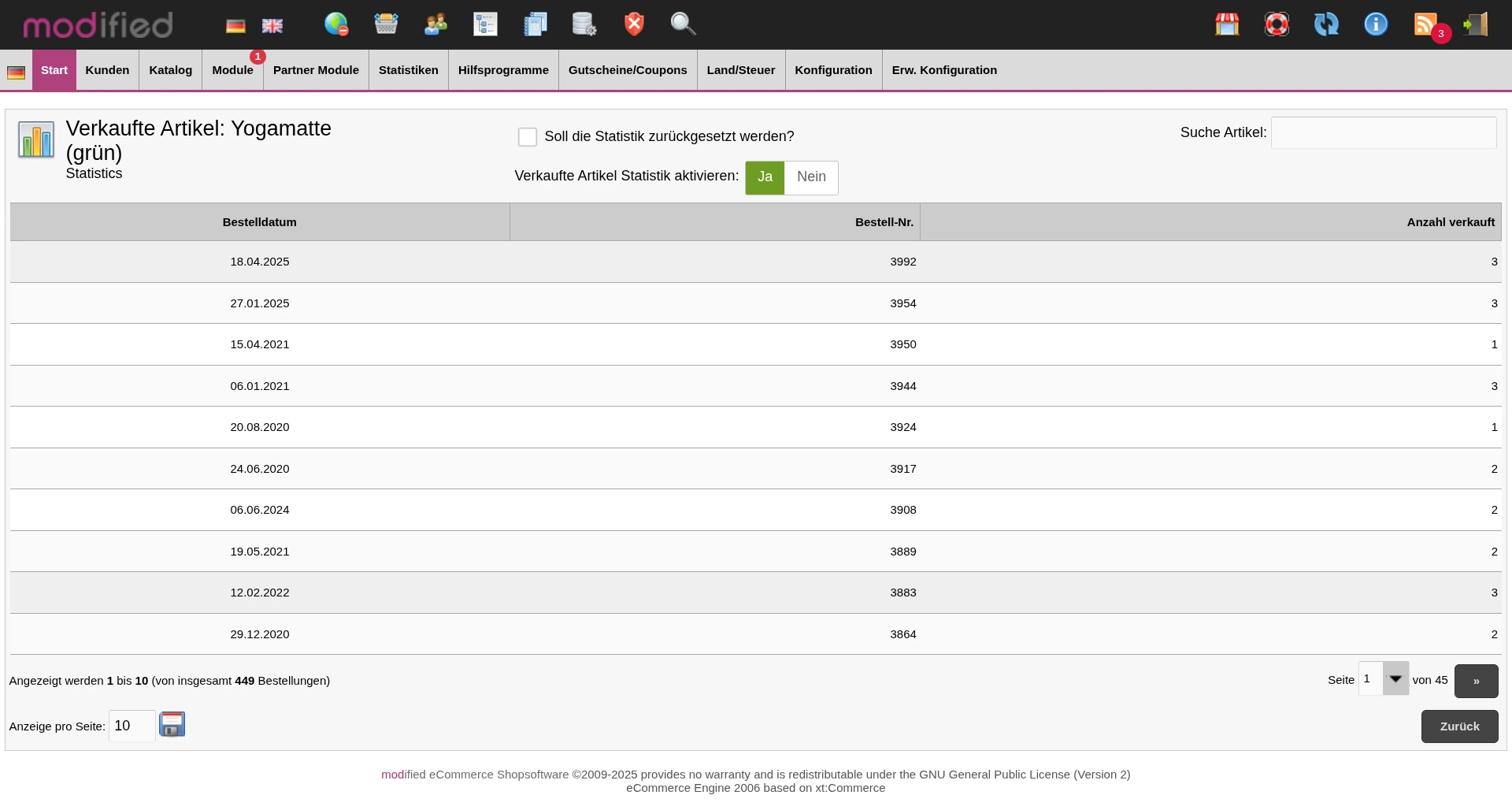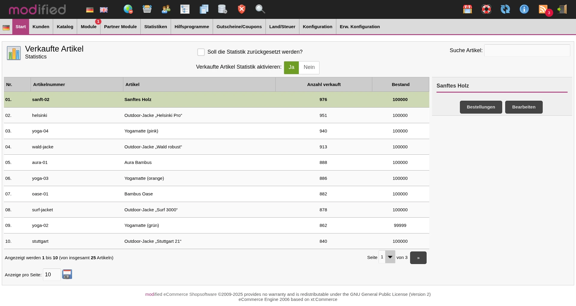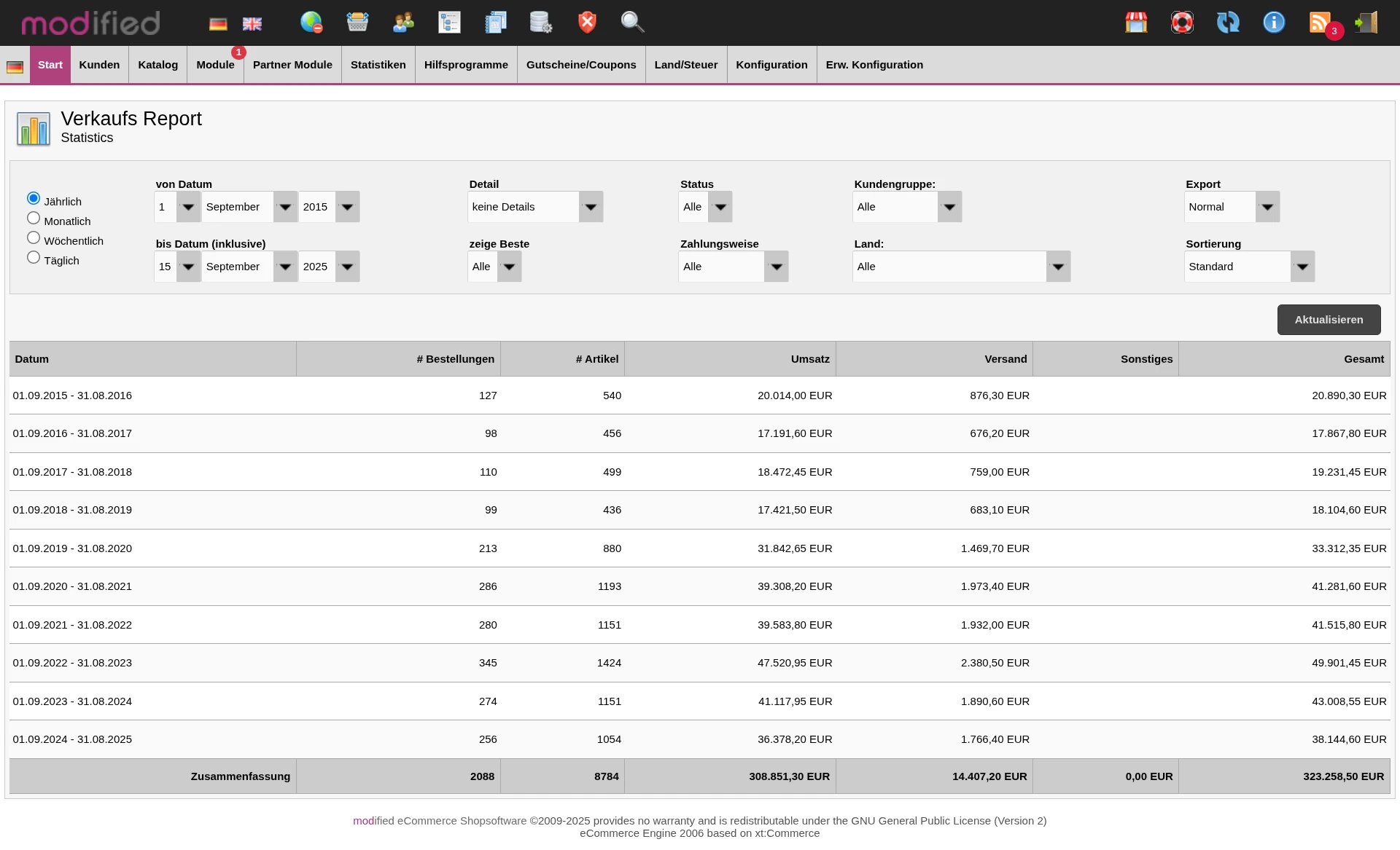 Mit „Absatzzahlen“ verwandeln wir unser modified-Backend in ein leistungsstarkes Analysezentrum. Wir gewinnen die Sicherheit, die nur datengetragene Gewissheit bieten kann, und können unseren Shop mit klaren Entscheidungen auf den nächsten Erfolgskurs bringen.