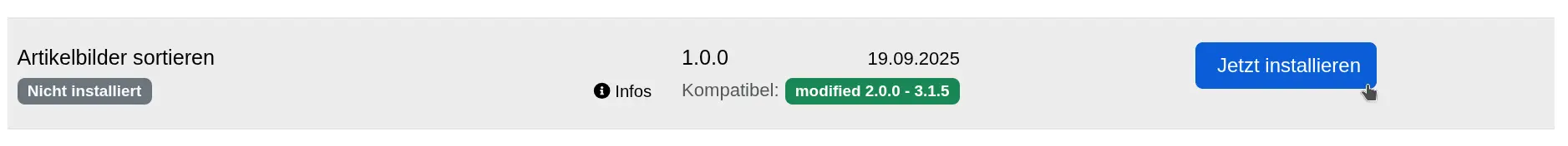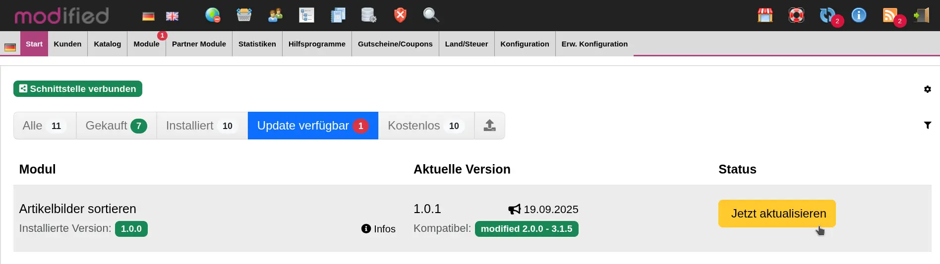 Der erste Eindruck zählt – besonders bei Produktbildern! 📸 Um unsere Bildergalerien perfekt in Szene zu setzen, steht das „Artikelbilder sortieren“-Modul für uns bereit. Wie alle meine modified Module, holen wir es uns ganz einfach per 1-Klick-Installation über die kostenlose Modulverwaltung für modified.