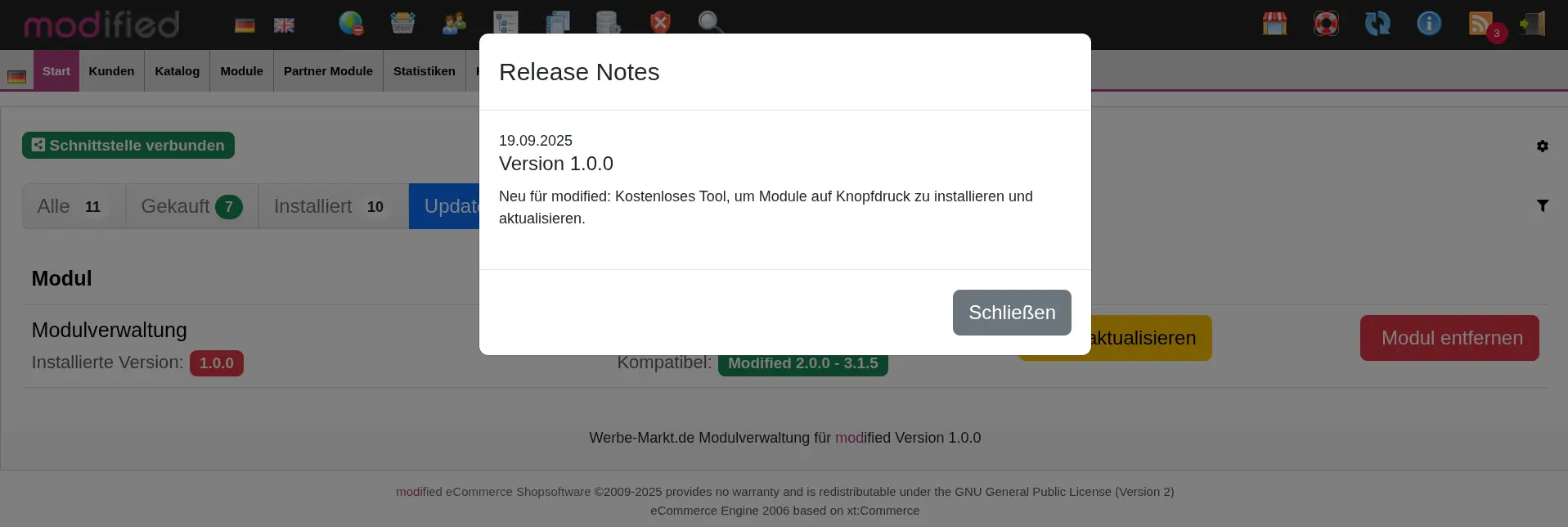 Die kostenlose Modulverwaltung für modified macht uns im Adminbereich zunächst darauf aufmerksam, dass ein Modul-Update verfügbar ist. Sofern wir noch Zugriff auf Updates zum betreffenden Modul haben, führen wir die Update-Installation einfach auf Knopfdruck durch.