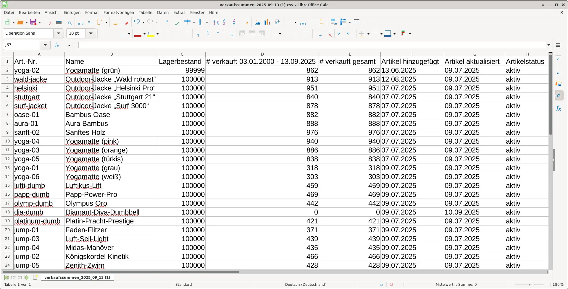 Wir erhalten einen klaren, strukturierten Blick auf unser Sortiment, der uns die wichtigsten Kennzahlen liefert: Artikelnummer, Artikelname – sogar mit Varianten, Lagerbestand pro Variante, Verkäufe im gewählten Zeitraum, Gesamtverkäufe seit Listung, Datum der Shopaufnahme, Zeitpunkt der letzten Änderung und den aktuellen Artikelstatus. All diese Daten werden uns als einfacher, sauber strukturierter CSV-Export zur Verfügung gestellt. Kein grafischer Schnickschnack, keine Ablenkung – sondern die pure Essenz, die wir brauchen, um fundierte Entscheidungen zu treffen. Es ist, als würden wir die DNA unseres Sortiments entschlüsseln, um seine Geheimnisse zu lüften und seine Zukunft zu formen.