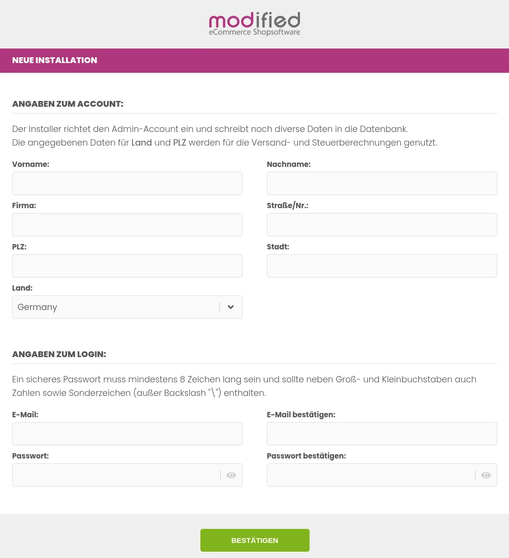 Technisch betrachtet ist das Adminkonto ein ganz normales Kundenkonto mit speziellen Zugriffsberechtigungen. Entsprechend sind als Shopbetreiber-Daten dieselben Daten (Adressdaten, E-Mail-Adresse und ein sicheres Passwort) anzugeben.