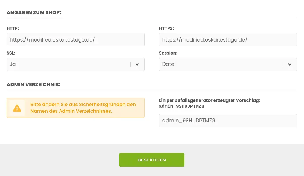 Hier betreten wir den geheimen Eingang. modified schlĂ€gt automatisch einen schwer zu erratenden Namen vor, z.B. admin_4WXAVETGUE. Diesen sollten wir ĂŒbernehmen oder durch einen Ă€hnlich kryptischen Pfad ersetzen â wie eine versteckte Pforte, die nur uns bekannt ist und die unser Shop-Schloss sicher hĂ€lt.