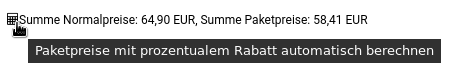Möchten Sie einen pauschalen Rabatt beim Erwerb von Paketen gewähren, der sich automatisch geänderten Artikelpreisen anpasst? Dann laden Sie die nachfolgende Erweiterung mittels Zip-Upload der kostenlosen Modulverwaltung in Ihren Shop.