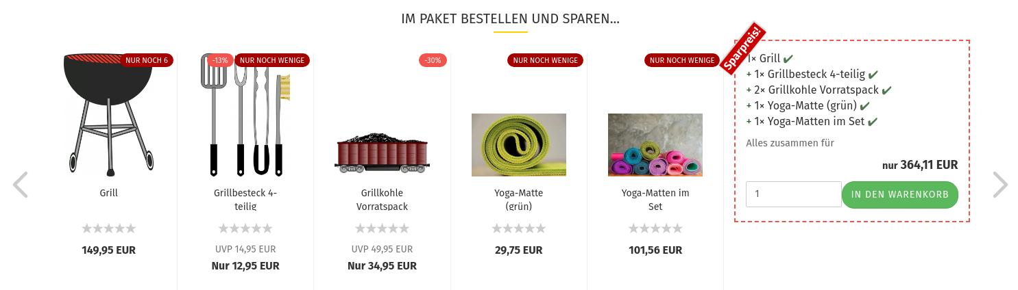 Dies ist besonders sinnvoll einsetzbar, um einen höherpreisigen Artikel zusammen mit günstigerem Zubehör anzubieten. Das könnte beispielsweise ein Trinkwassersprudler mit mehreren CO2-Zylindern sein, Drucker & Patronen, Lampen & LEDs, Pumpen & Filter, Elektrozahnbürsten & Aufsteckbürsten, Reinigungssysteme mit austauschbaren Schwämmen und vieles mehr.